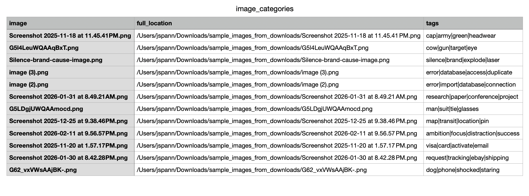 Next I gave the VLM the tags from the images and had it compile 5 overall themes for them based on its role as an “expert organizer”. With those, I had the script create a directory for each theme and map (again with the VLM) each image, based on its tags, to one of the 5 themes and move the folder to the directory.