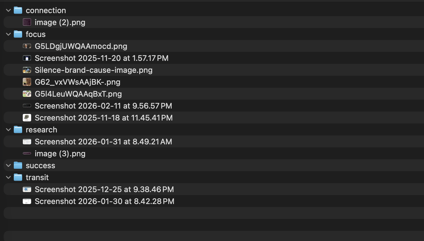 At the time of writing there’s 834 PNGs in the folder (Nov 13, 2025 - April 2, 2026). If I spent 3 seconds per image (lower bound), I could have this done in an hour; That never happens though and I’d mull over questions like “why did I take this photo?” or “Was it the only one like this?”, which would add to that time. While I do want to go through these pictures, constantly context switching between what is in the images is not something I repeatedly want to do.